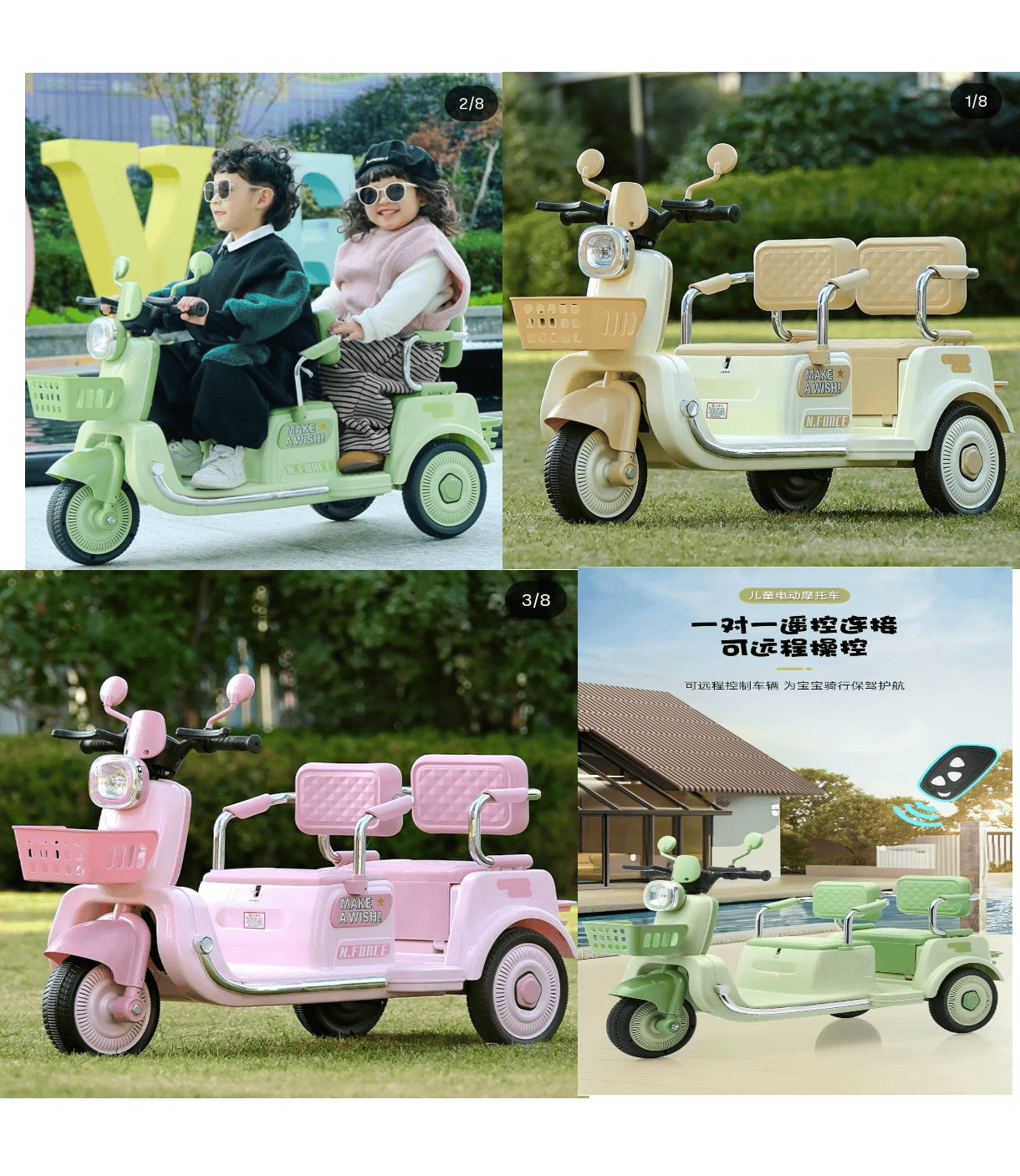 TRIMOTO ELECTRICA KIDS ✅Material: Plastico abs+Metal ✅Tamaño: 120x70x55cm ✅Edad: 1 a 8 años ✅Capacidad: 120kg ▶️Manejo: ✅Manejo con control remoto ✅Manejo manual electronico ✅Bateria: 12V-4mAh ✅Motor: 380 Watts ✅Velocidad: 3km/h ✅Duracion bateria: 3 horas ✅Funcion: Bluetooth ✅Tablero musical con luces ✅3 ruedas ✅3 colores : rosado, amarillo, verde
